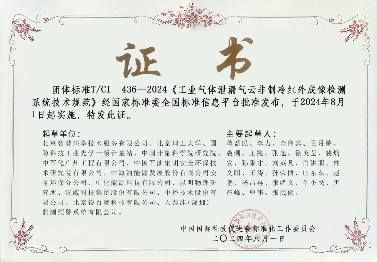 Certificate of Group Standard T/CI 436-2024 "Technical Specification for Industrial Gas Leakage Gas Cloud Non cooled Infrared Imaging Detection System"